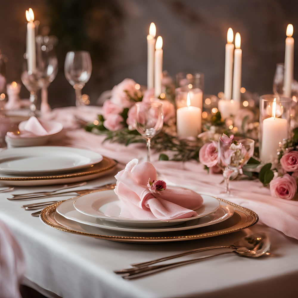 Create a beautiful pink tablescape to serve as a beautiful focal point for your dinner guests. Use plain white or gold dishware and then add a pop of color with red or pink napkins, flowers, and other table decor. Tie them with ribbon, twine, or dried flowers and include a handwritten note or a heart-shaped tag for a sweet, inexpensive touch. Plus, adding a sheer table runner completes this beautiful tablescape!